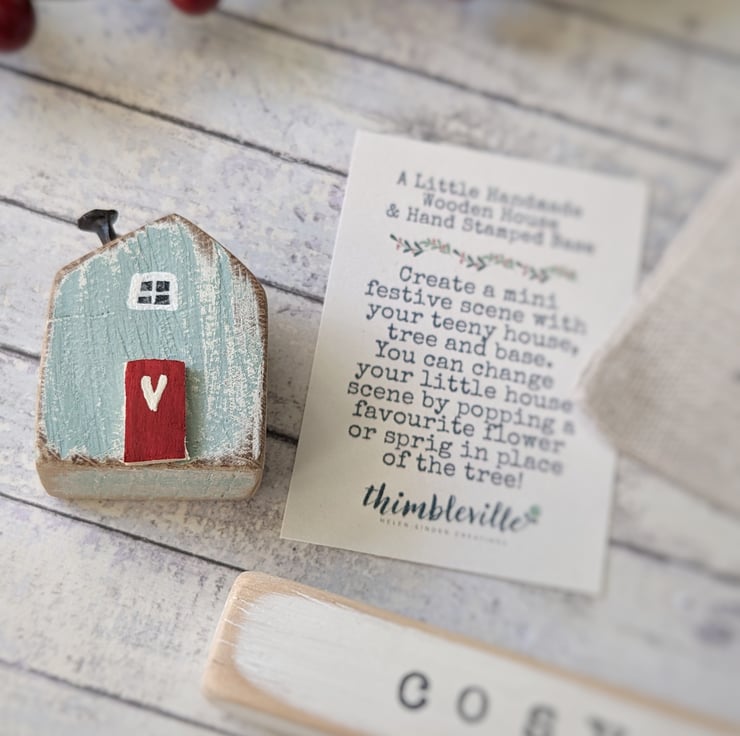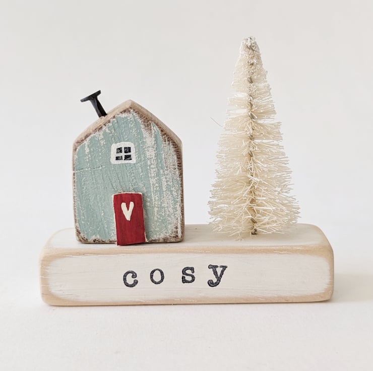 On a painted wooden base stamped with the word cosy, add your teeny painted house and tree.