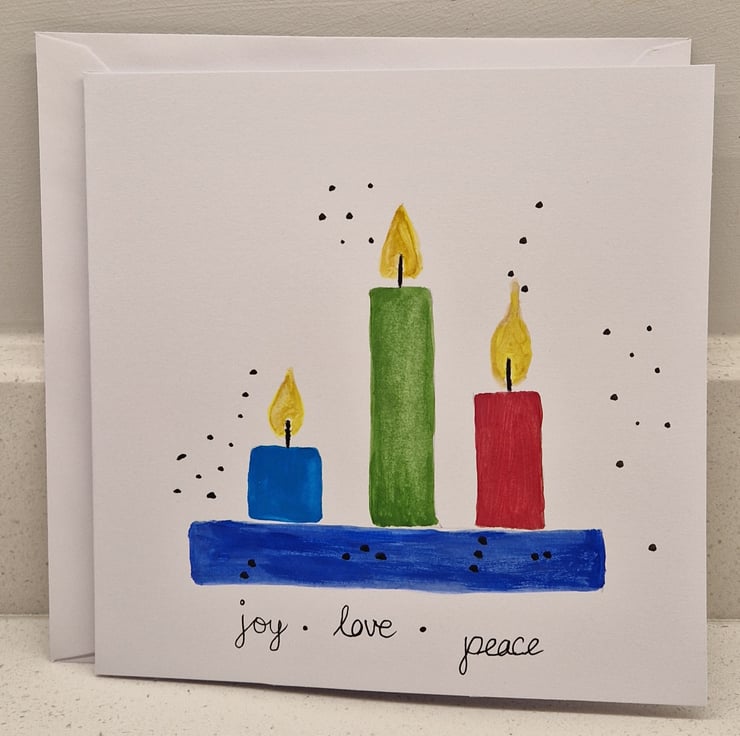 Handpainted watercolour Christmas card of three burning candles, with the message Joy Love Peace on the front.