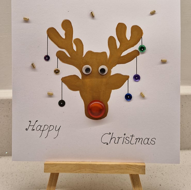 Happy Christmas, reindeer Rudolph Christmas card, adorned with sequins, a one off unique piece.