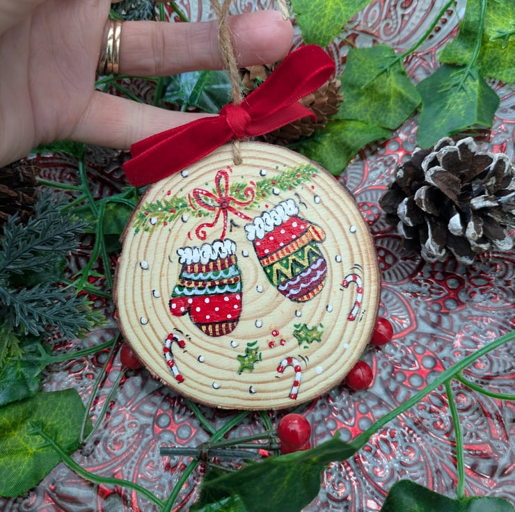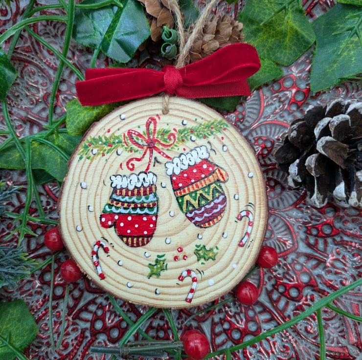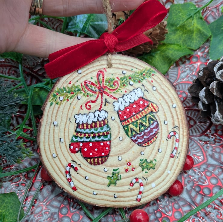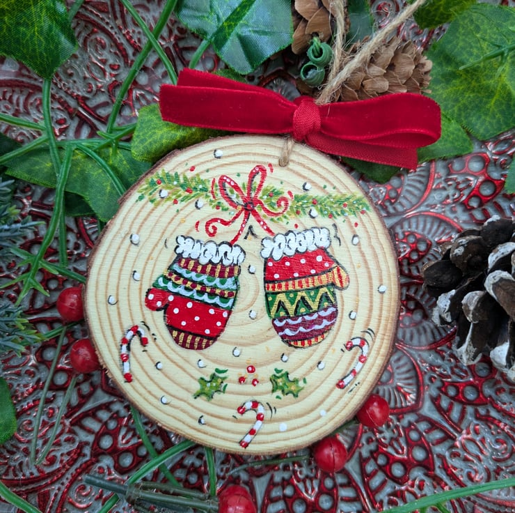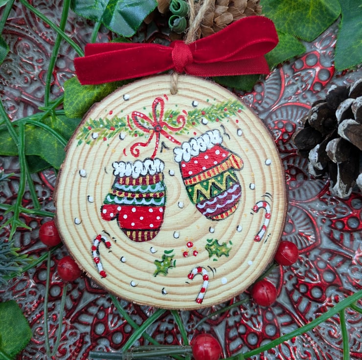 A sweet hand-painted Christmas mittens log slice Christmas decoration. Hand-painted in acrylics and varnished with a gloss varnish.