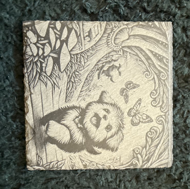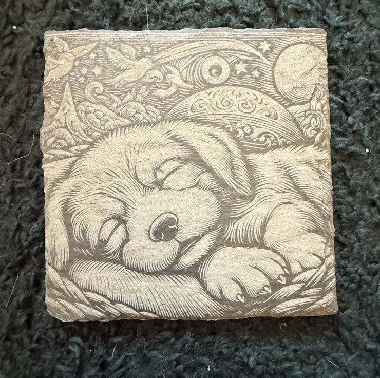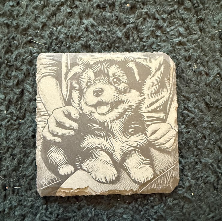 Bring the charm of man's best friend into your home with these unique, beautifully etched slate coasters. Each coaster showcases intricate, high-contrast artwork of an adorable puppy, blending rustic elegance with heartwarming design.