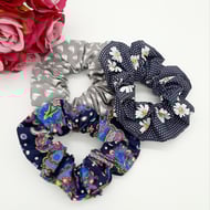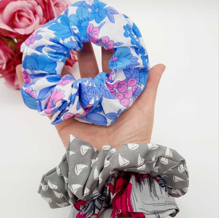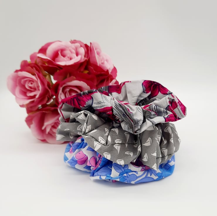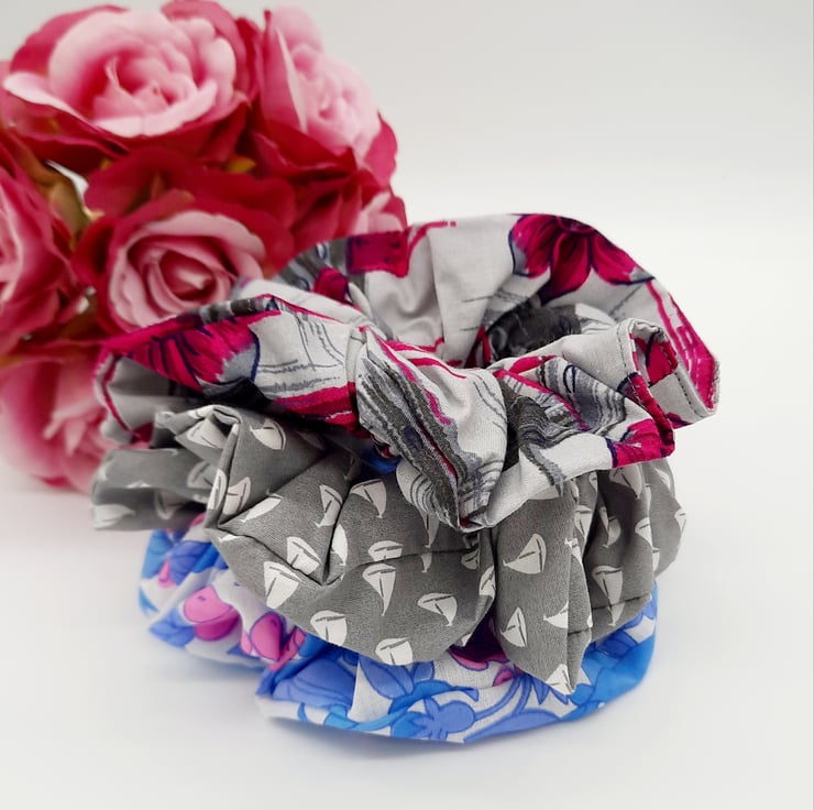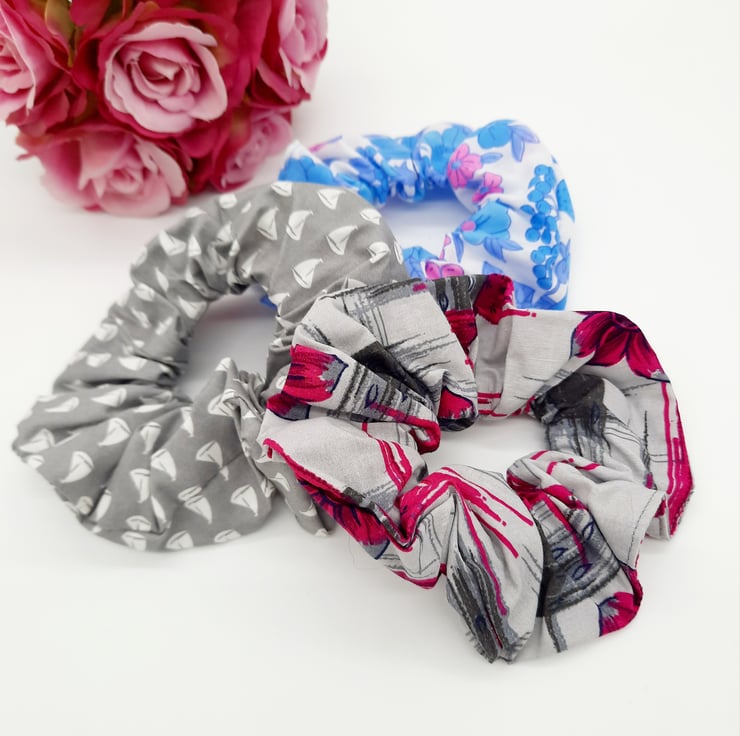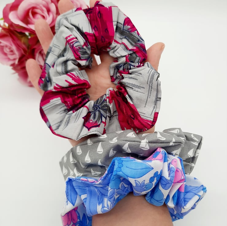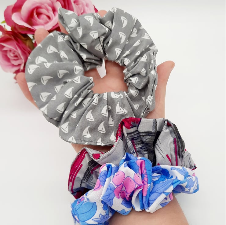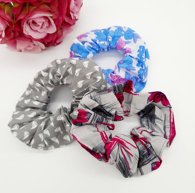Hair scrunchie set, grey sail boat, blue floral and raspberry pink.