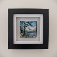 The painting itself is 10cm diameter, created on a circular stretched canvas, using acrylic paints and inks, before being varnished with gloss and framed in an 18 x 18 cm wooden box frame.