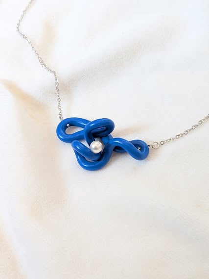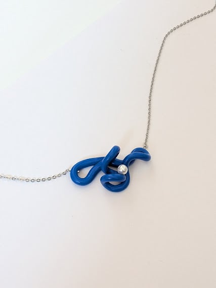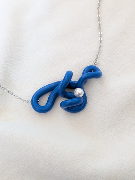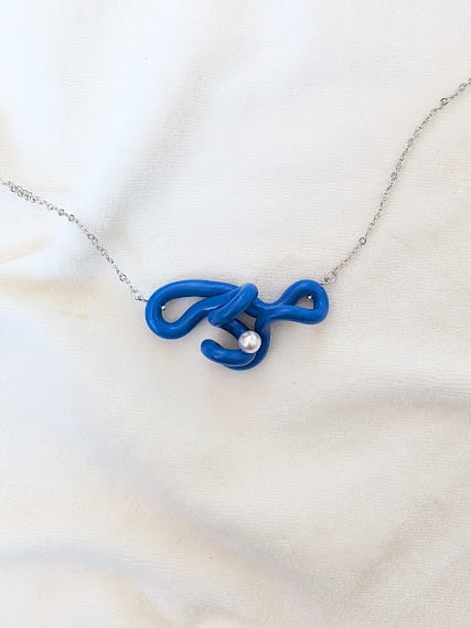 This necklace is a wearable piece of abstract art. Hand-sculpted from vibrant Cobalt Blue polymer clay, the pendant features a dynamic, freely flowing knot inspired by the organic movement of cord or thread. Unlike a structured bow, this piece celebrates fluidity and spontaneity, making each one subtly unique.
