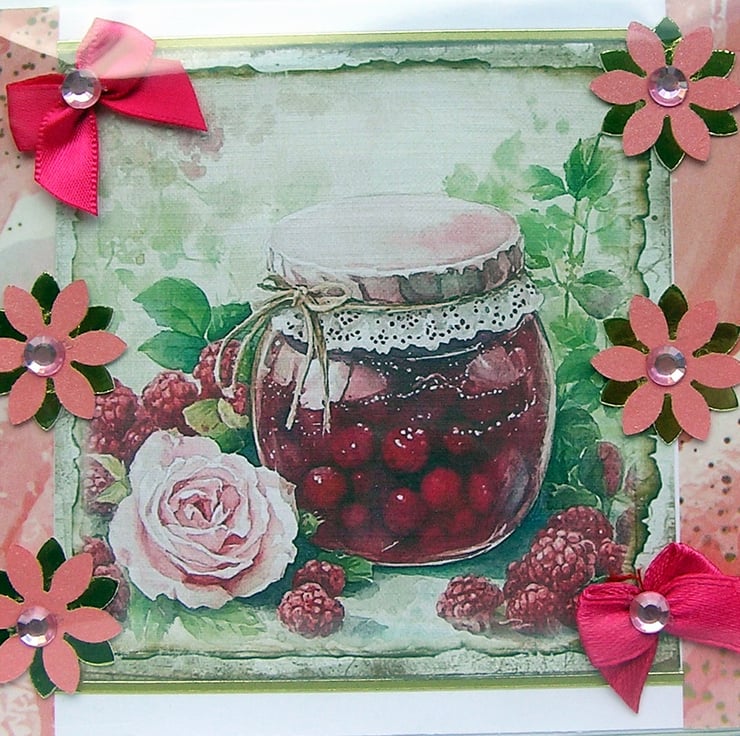 Cherries & Roses - Hand Crafted Decoupage Greeting Card - Blank 2897
