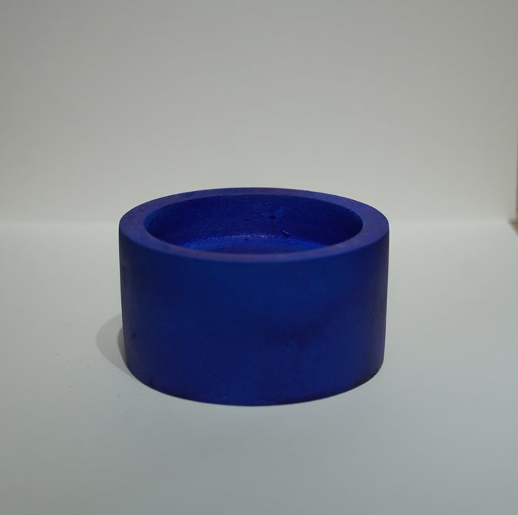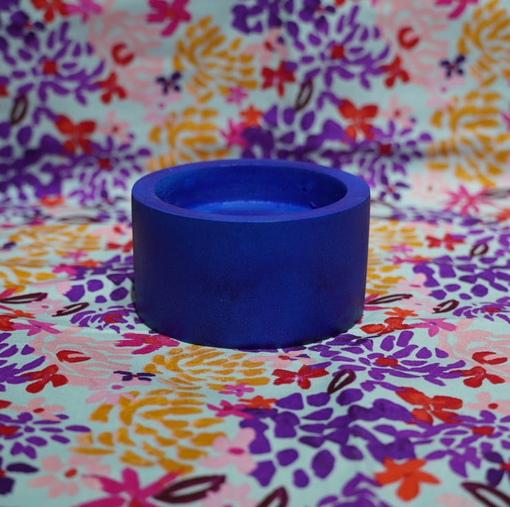 Turned poplar wood candle holder, 7cm diameter and 4cm tall to fit a 5.8cm diameter candle. Finished with a blue paint with a clear lacquer with a felt base to prevent scratches on your surfaces.