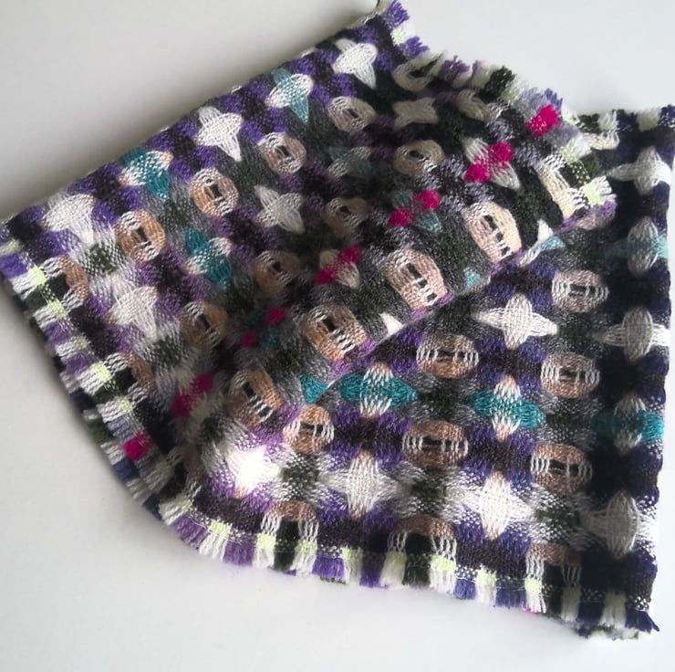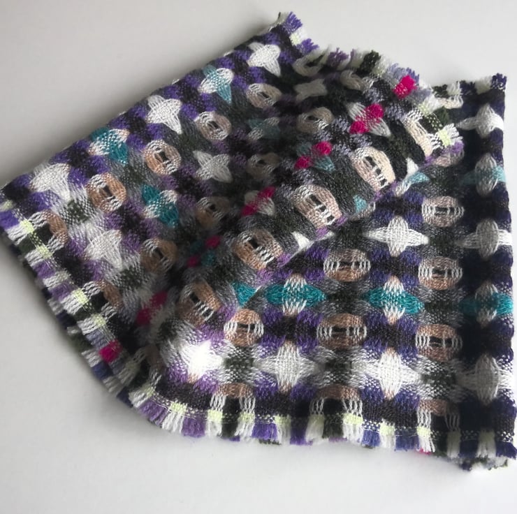 A handwoven cowl in the softest merino lambswool, in a deflected doubleweave draft in graduated shades of purple and green and accents of teal and fuchsia. The structure produces a double-sided and lightweight cowl that is versatile and practical.