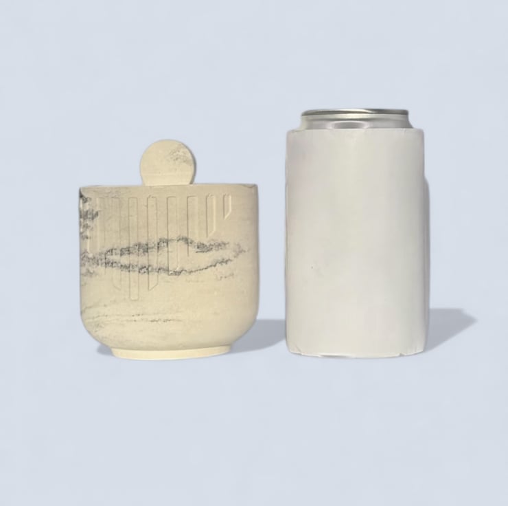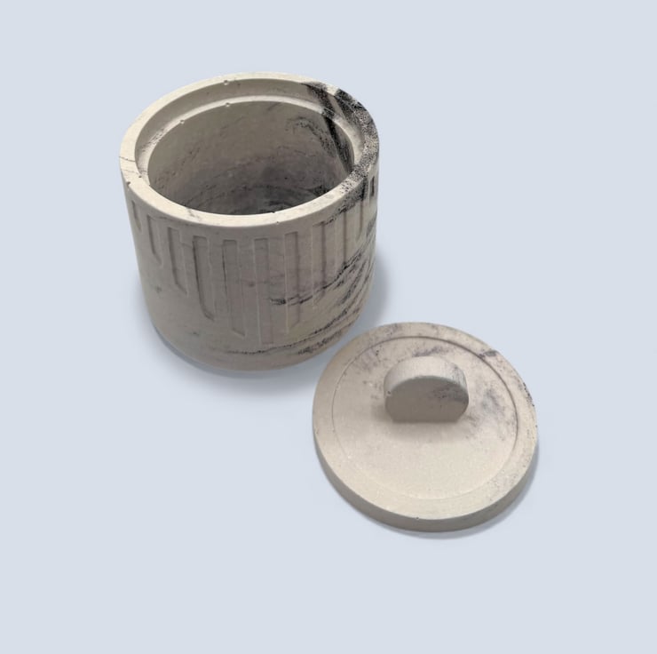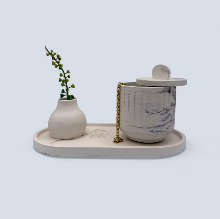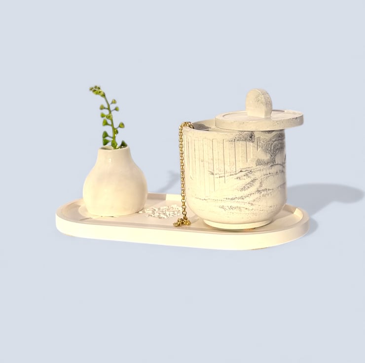 Each trinket pot is handmade in my home studio using a natural water based mineral material with a hard stone like finish. The marbling forms naturally as it is mixed, so every piece has a unique pattern. Small variations such as tiny air bubbles or gentle shifts in the swirl appear during the handmade process and add to its individuality. The exterior is hand polished with a plant based wax sealer for a soft satin sheen, while the interior is left unsealed so the surface stays smooth and natural. Cork pads are attached to the base to help protect your furniture.