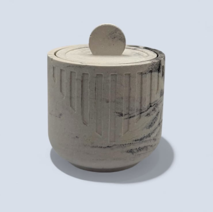 The soft white and grey marbling on this jewellery box was inspired by the quiet patterns found in weathered stone and worn coastal cliffs. I wanted to create a piece that felt calm and grounding, with gentle swirls that look like layers of rock shaped over time. The vertical grooves add a modern touch, almost like tiny carved columns, giving the box a clean and contemporary feel.