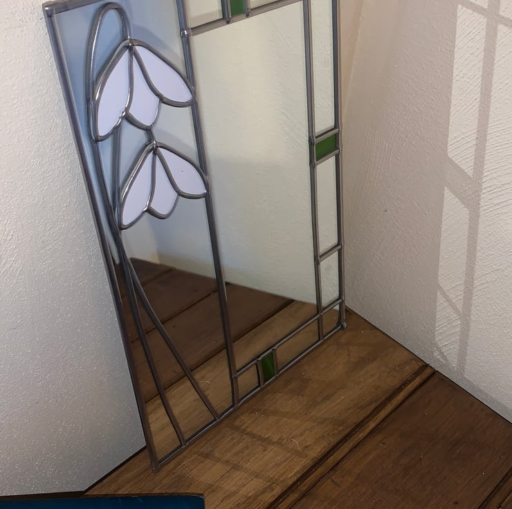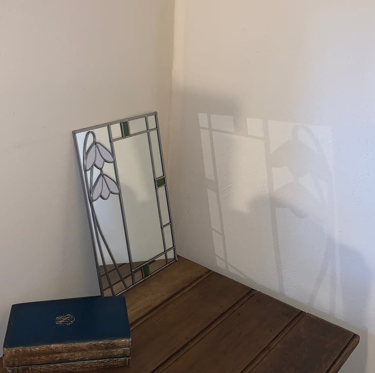 A lovely small mirror in the style of Charles Rennie Mackintosh's Art Nouveau and Art Deco- Snowdrop design inspired artwork. With beautiful lead work.