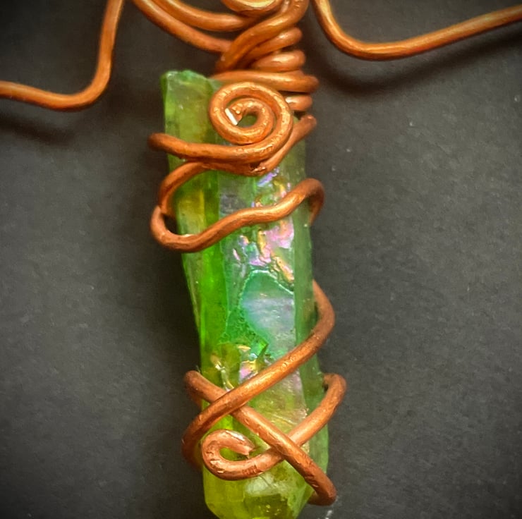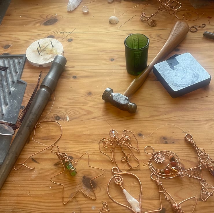 I have braided the copper wire and created a circle at the top of the star from which hangs a velvet ribbon. This six point star can be a Christmas decoration or a talisman to hang wherever suits you in your home.