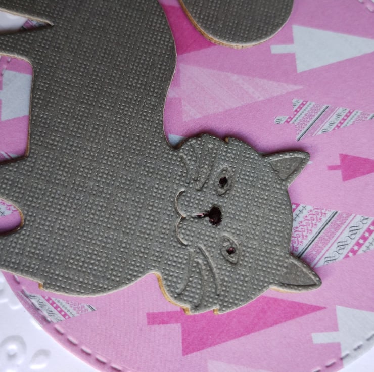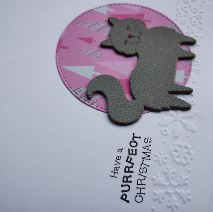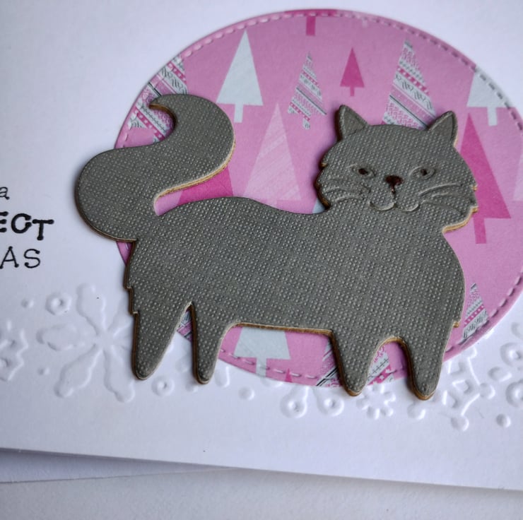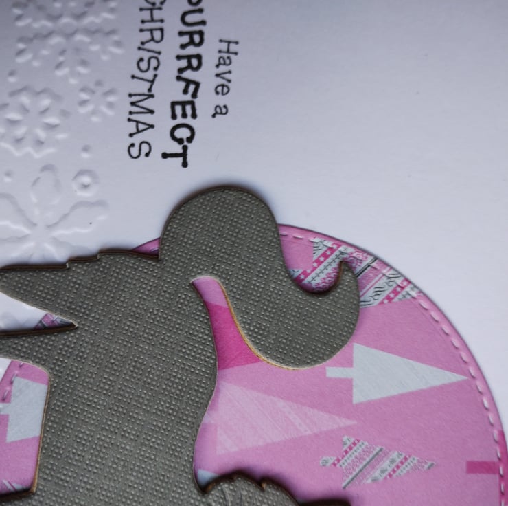I've cut the little cat from grey card and hand coloured a couple of tiny elements to give a little more detail. I've added a circle of pretty pink Christmas tree patterned paper and also embossed a line of snowflakes along the bottom for added texture.