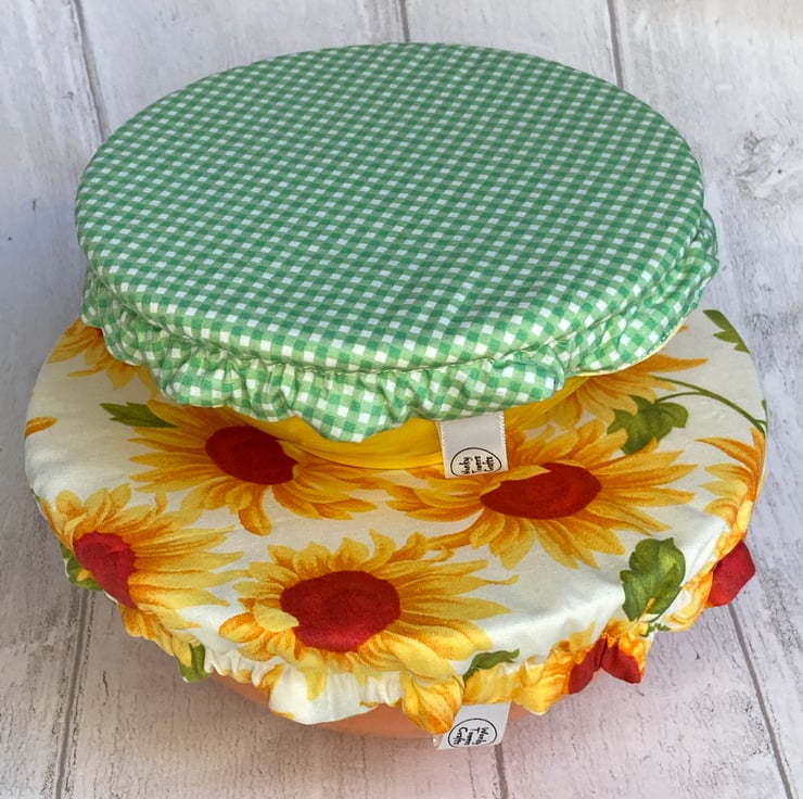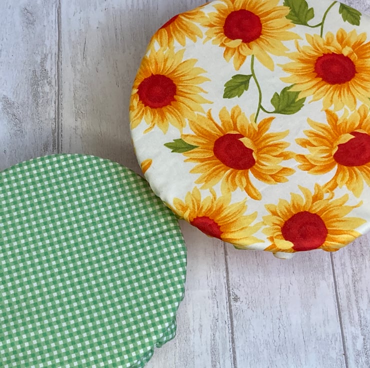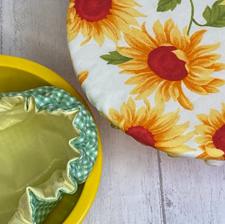 This set of 2 covers will fit bowls approximately 19cm and 16cm (7.5"and 6"). They are made from 2 co-ordinating fabrics. One is white, decorate with bright sunflowers. The other is a pale green check. The PUL lining is pale yellow.