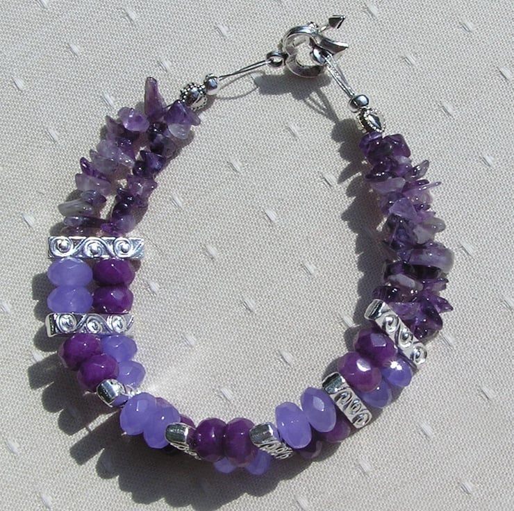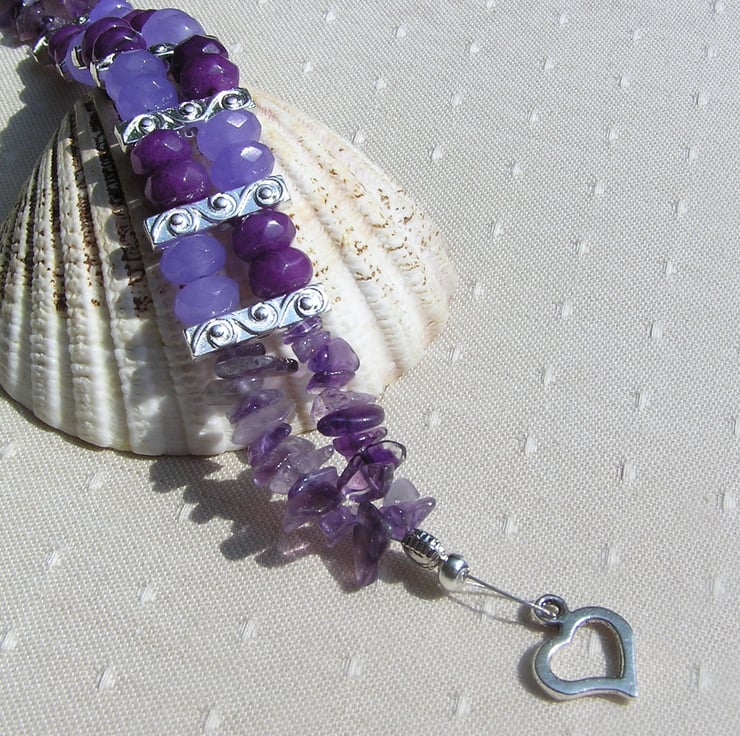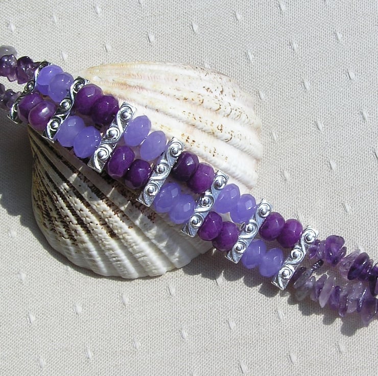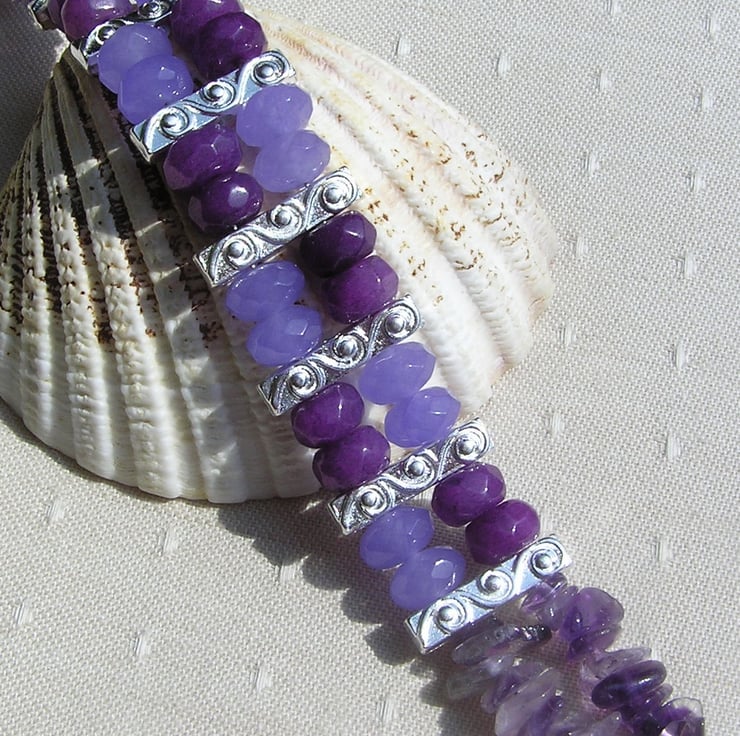This Stunning Bracelet is made from Purple Alexandrite and Purple Jade rondelle shaped beads in a chequer board design with contrasting Amethyst Gem-Chips… each section separated by an ornately decorated Tibetan Silver Bar Spacer with a tiny Silver Heart at each end - a Beautiful combination that will look stunning either worn casually or with something more Elegant for a Special Evening out