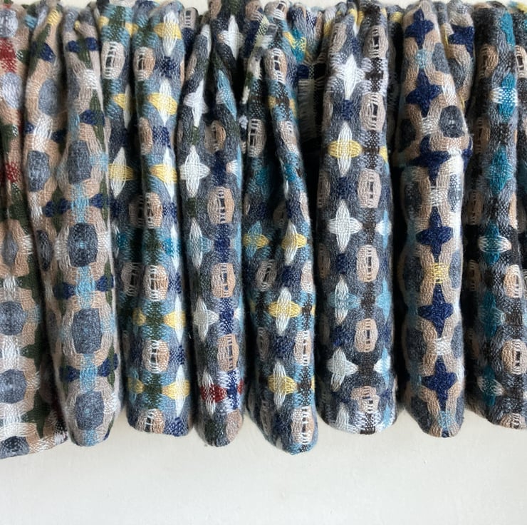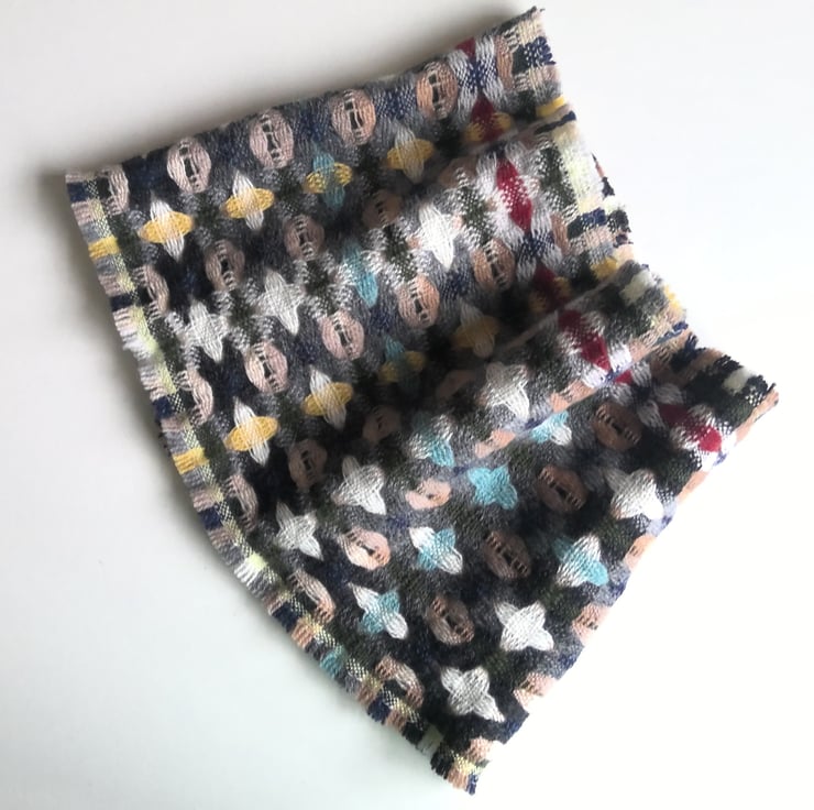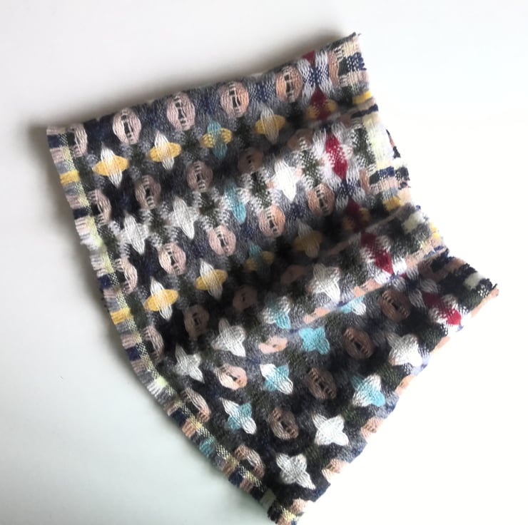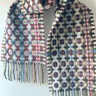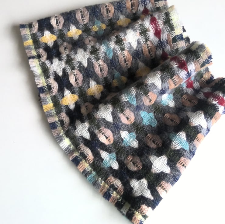 A handwoven cowl in the softest merino lambswool, in a deflected doubleweave draft in graduated shades of grey, buff, green and brown with accents of sea spray, rust and lemon. The structure produces a double-sided and lightweight cowl that is versatile and practical.