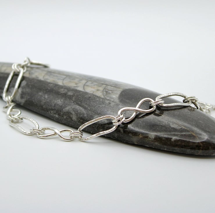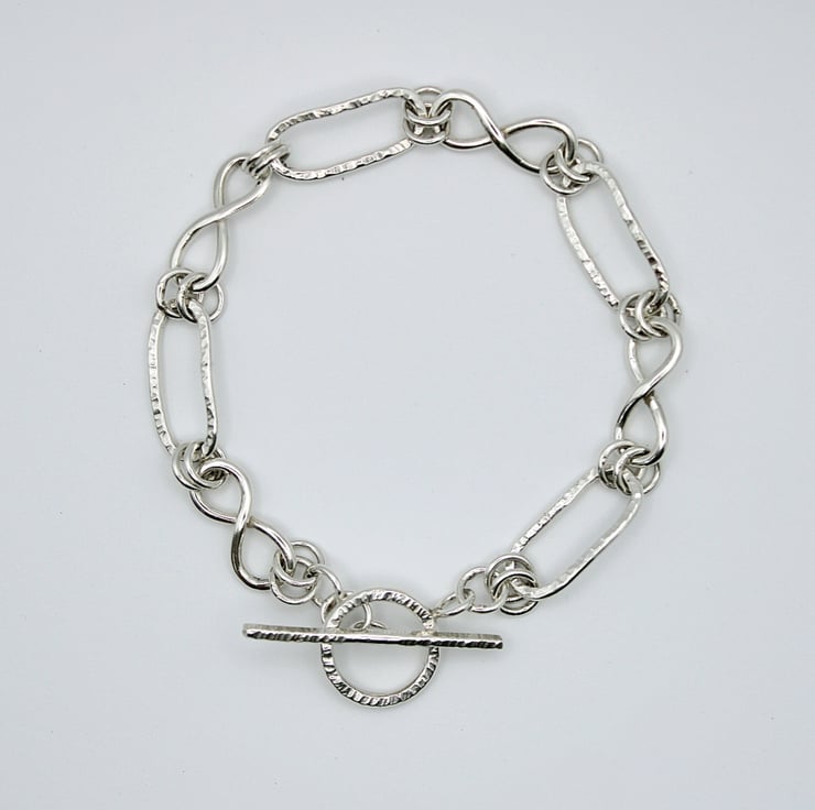This Sterling Silver bracelet has been made combining paperclip links with twisted or knotted links each connected to the other with 7mm silver circles. The whole bracelet is secured with a handmade hammered toggle clasp. Each paperclip link has been hammered with the straight edge of a rivet hammer as has the toggle clasp. This gives the effect of lots of tiny straight indents in the surface of the silver to give that extra light reflecting shine and sparkle.