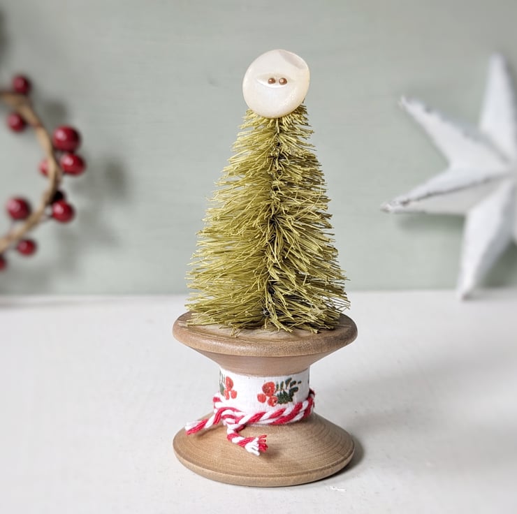 A little Festive tree sits atop a worn vintage wooden bobbin with a teeny mother of pearl button for a star!