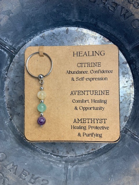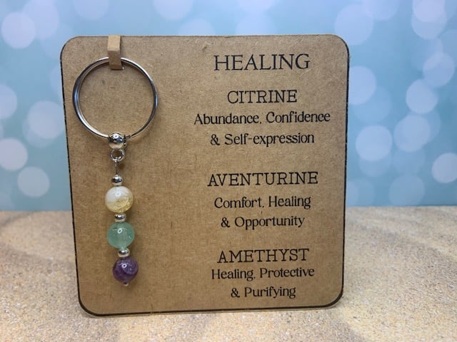 A Gemstone keyring for Healing, has Citrine a symbol of abundance, confidence, self - expression. Adventurine a symbol comfort, healing and opportunity. Amethyst a symbol of Healing, protective and purify