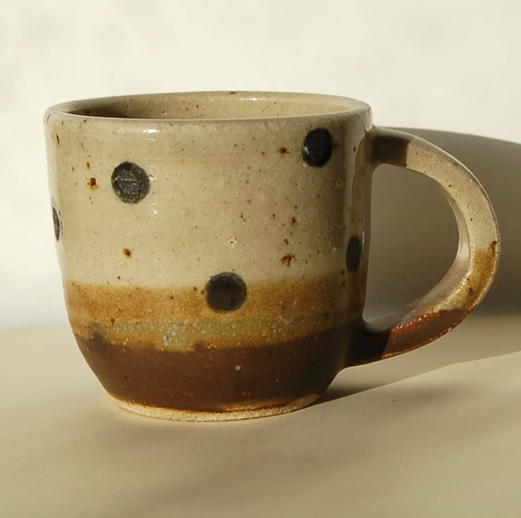 Pretty rustic cup in natural flecked clay with accent decoration on shades of coffee brown. Generous handle on a small cup. 7 cms tall.