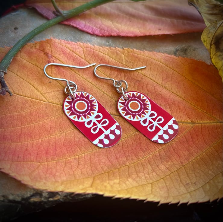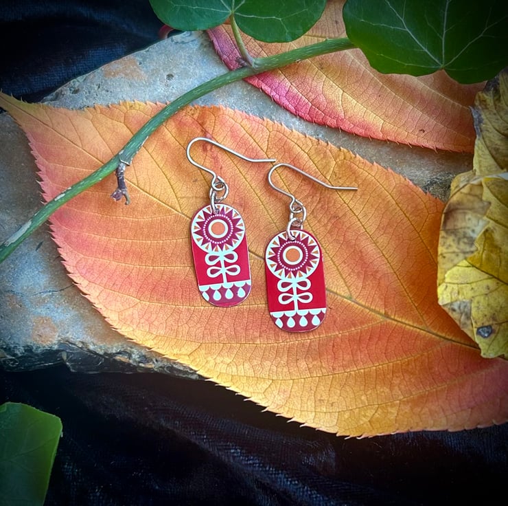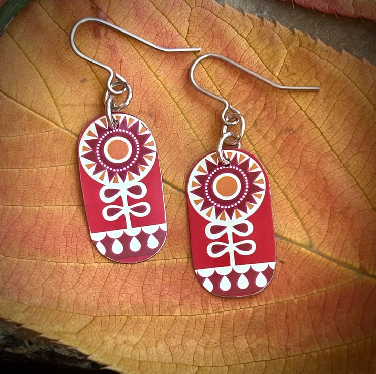 These stylised flowers were cut from an M&S biscuit tin, then filed, pierced, and hung from surgical steel ear wires.