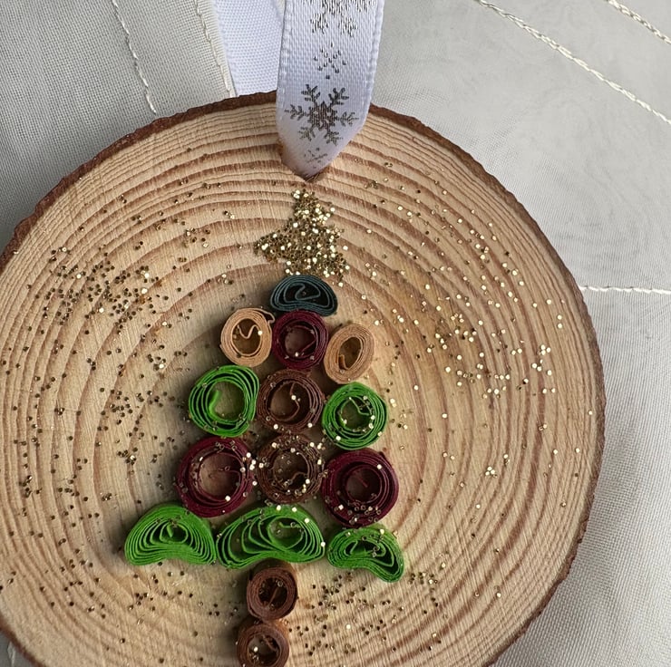 Handmade wooden bauble with paper quilled Christmas tree and glitter detail. Hang from your tree or mantelpiece with the white snowflake decorated ribbon. Approx 5 cm excluding ribbon.