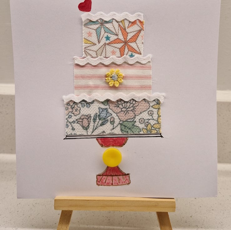 Pretty birthday card of a tiered birthday cake with a love heart on top, using fabric & a button.