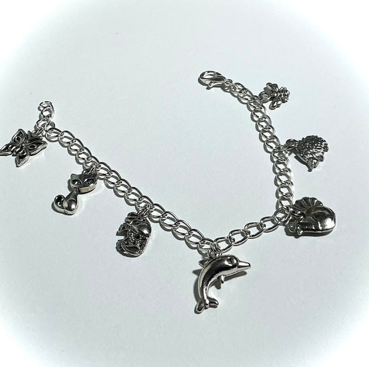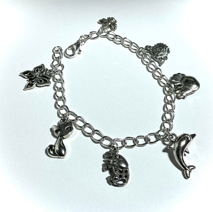 Silver charm bracelet with a selection of cute Tibetan silver animal charms on a silver plated chain with a secure lobster clasp fastener.