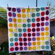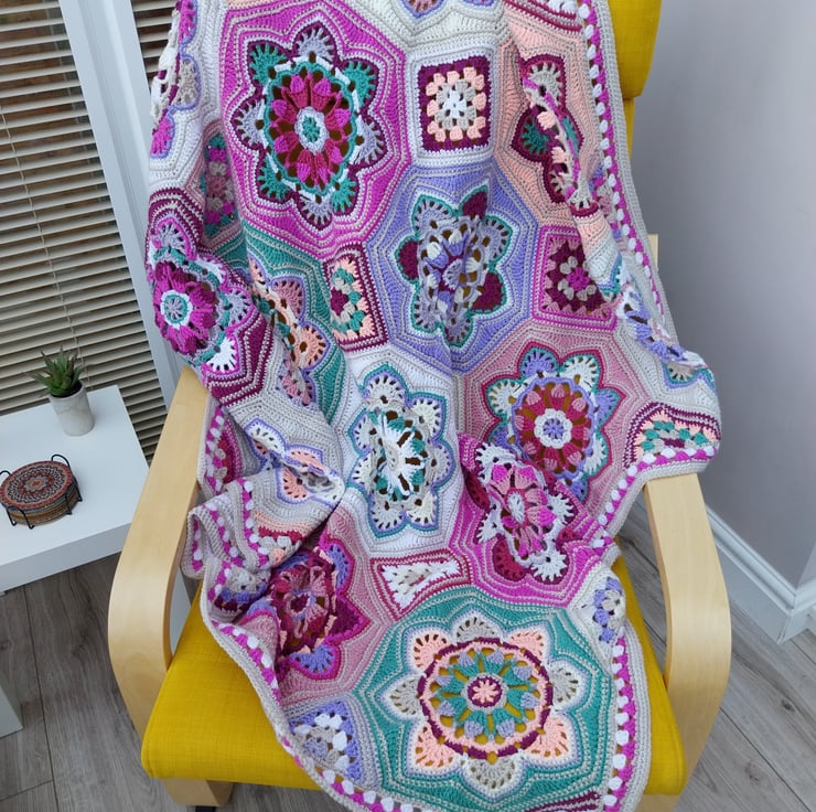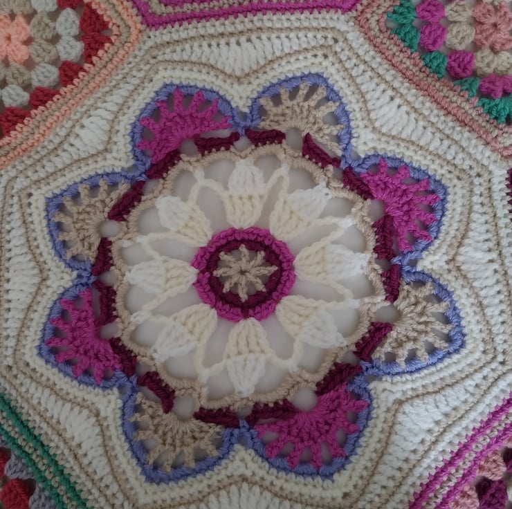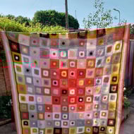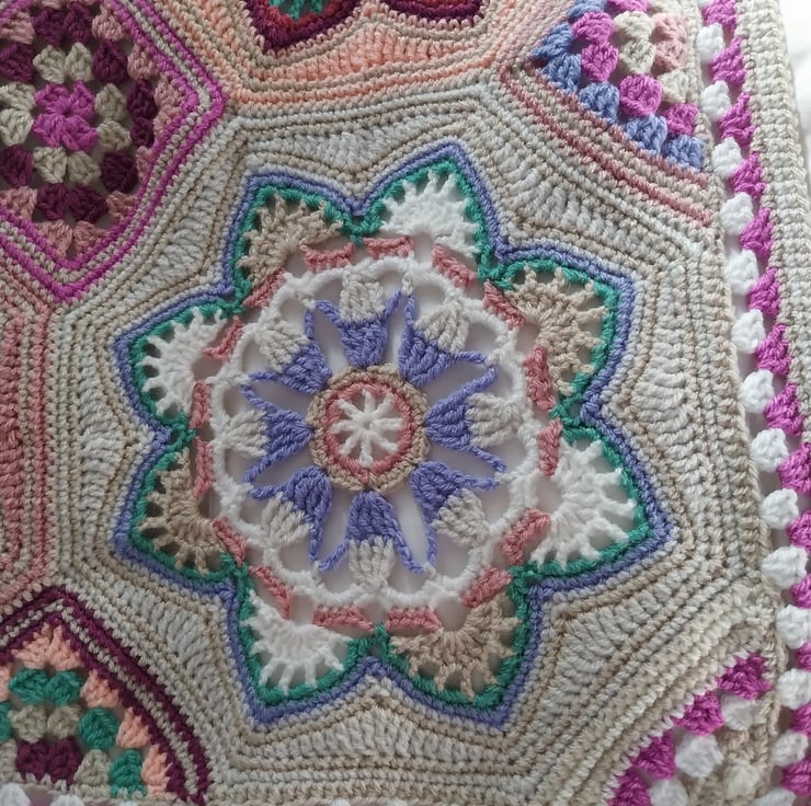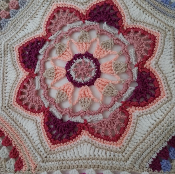Pretty crochet blanket of joined octagons with small granny squares in between, in shades of pink, cream, white, parchment, green and peach.
