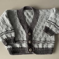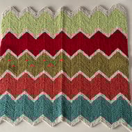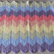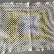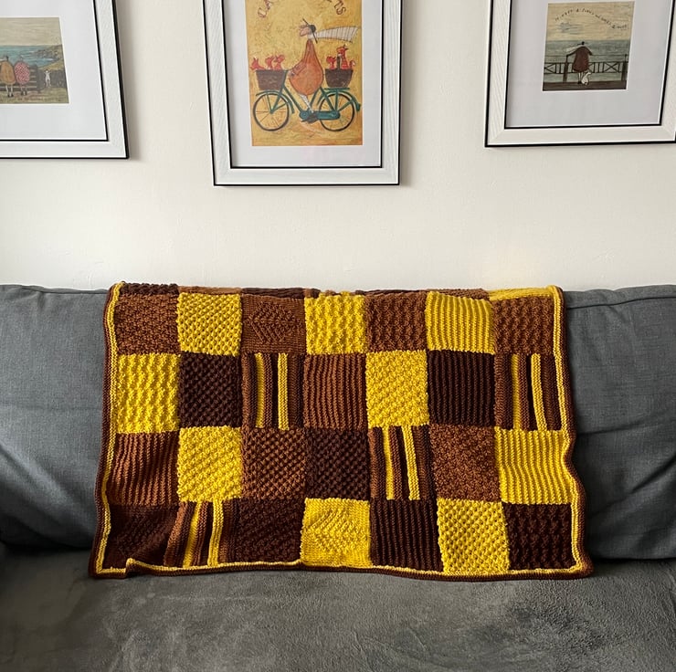 Hand knitted lap blanket in decorative square patterns. Made in double knitting yarn in mustard, golden brown and dark brown and edged in the same colours.