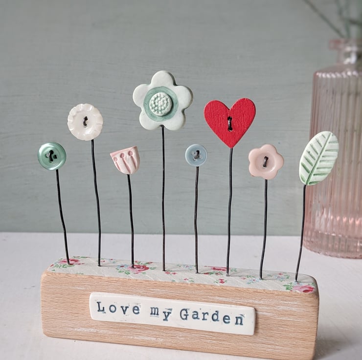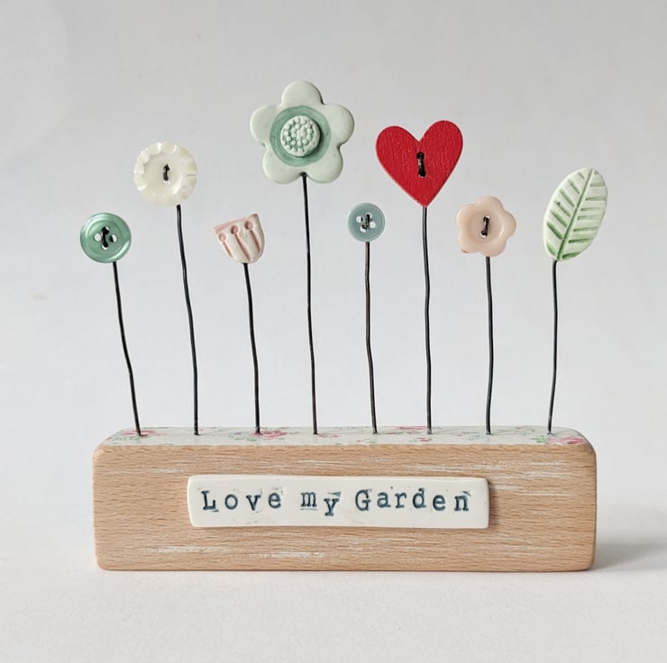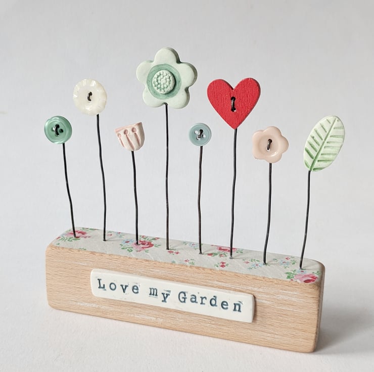 Clay and Button Flower Garden in a Wood Block 'Love my Garden'