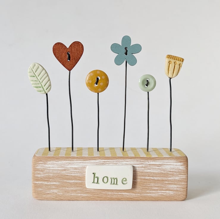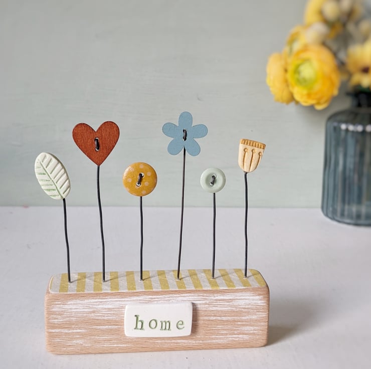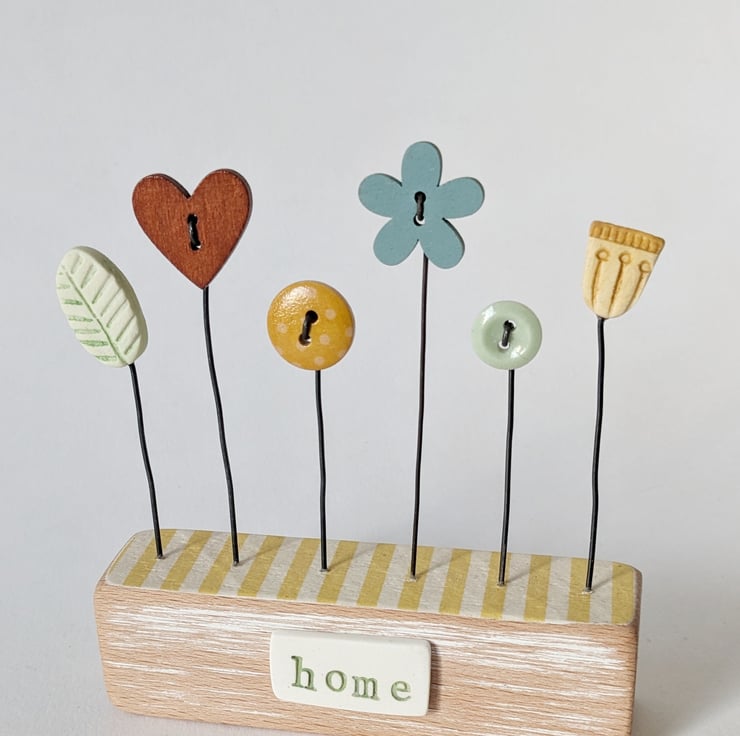 Button flowers grow in a row in this little garden with a clay leaf and flower. They stand on their wire stalks in a wooden block with a decoupaged floral top.