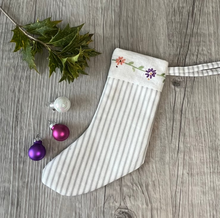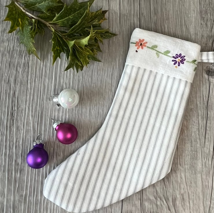 This charming Christmas stocking combines pieces of an embroidered tablecloth with a more modern minimalist grey and white ticking style striped cotton. It could be filled with little gifts or simply used as a decoration either in a traditional or contemporary setting. Its calming whites and greys are a welcome change from red and green and it would make a lovely seasonal gift for a friend.
