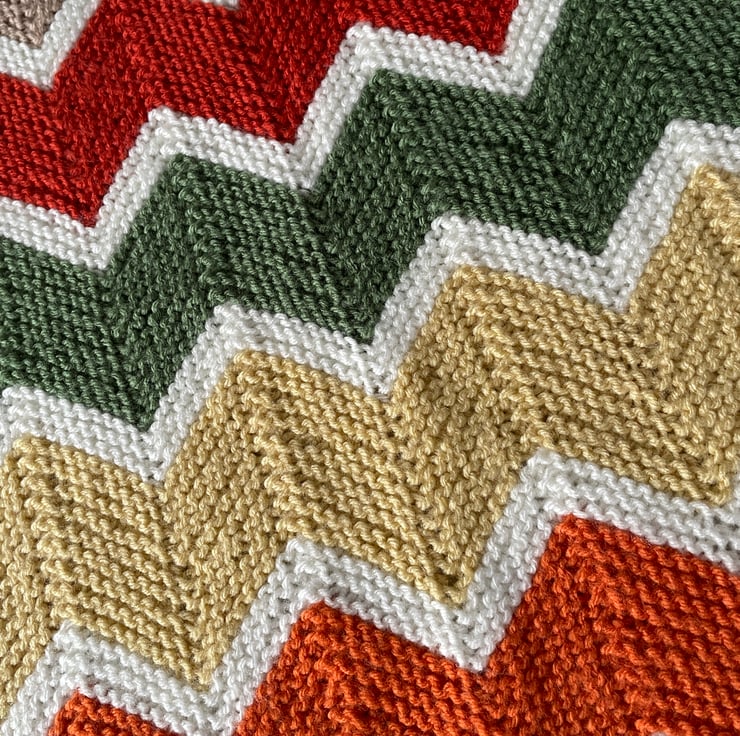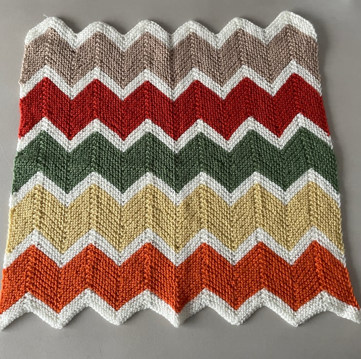 Hand knitted baby blanket in a zig zag pattern. Knitted in double knitting wool in white, green, red, brown, burnt orange and yellow.