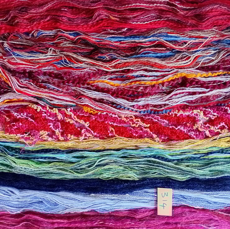 An inspirational bundle of fibres weighing approximately 55-65g in a variety of colours, textures, weights and thicknesses, 1 ply, 2 ply, DK, chunky