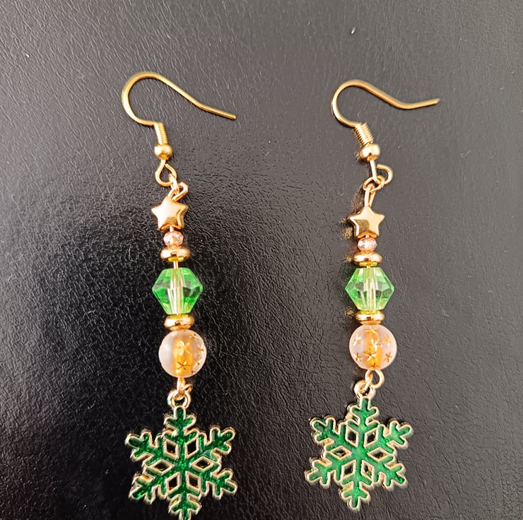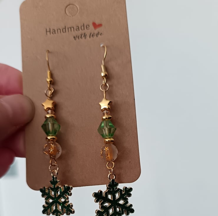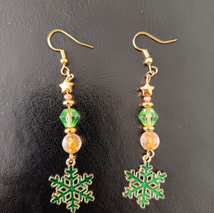 These handmade earrings are crafted with enamel gold and green snowflake charms, decorative gold spacers, stainless steel hooks, gold star beads, green glass beads and large frosted beads with gold star details.
