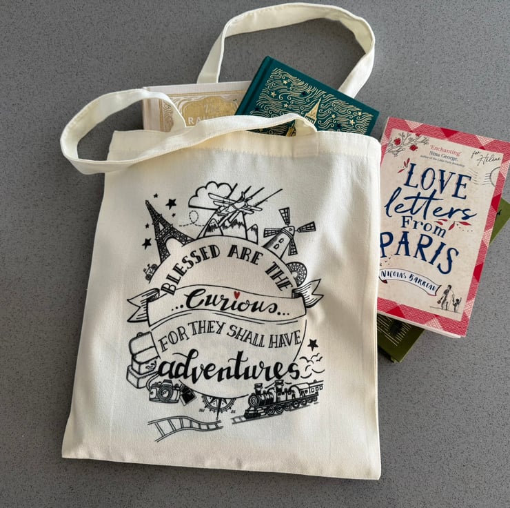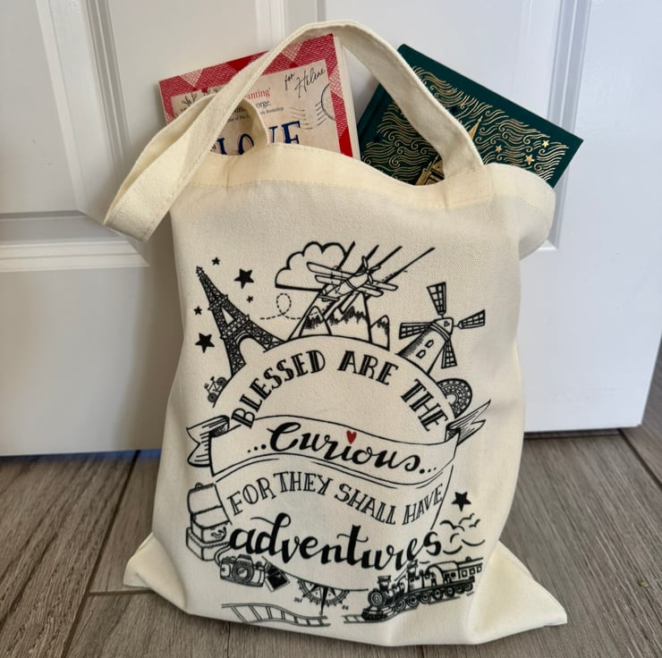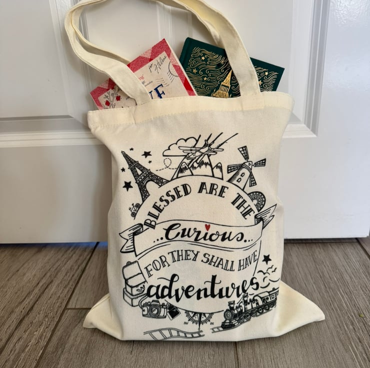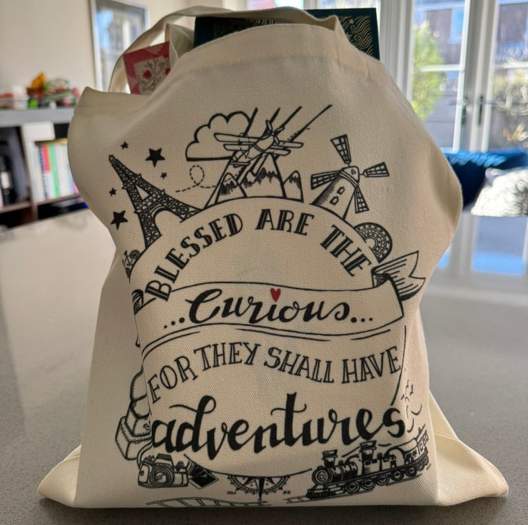 This makes a wonderful gift for anyone that loves travel or adventure and is the perfect size to contain all your hand bag overflow. It’s not a large tote bag for shopping but more a tote bag to contain your special items, books and note pads.