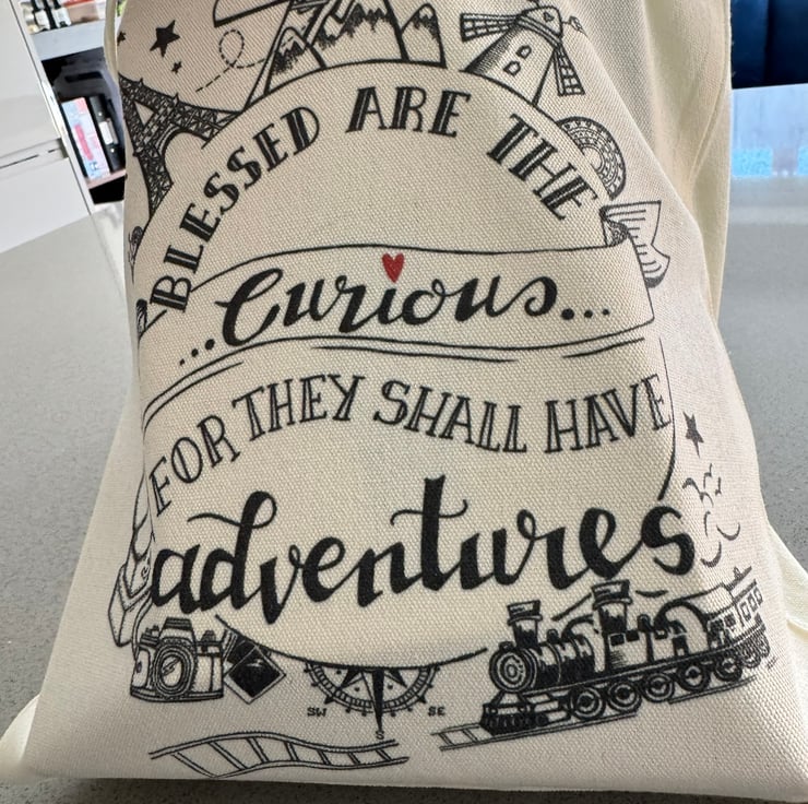 The illustration depicts cameras, books, the Eiffel Tower, a windmill, suitcases and many more items associated with travel and adventure. The quote in the middle says “Bless3d are the curious, for they shall have adventure “.