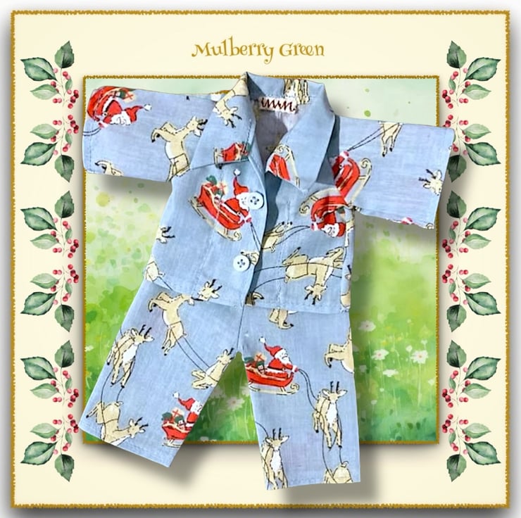 A cute little pair of pale blue pyjamas in a Father Christmas print to fit the Mulberry Green characters. The pyjamas are made from polyester cotton and are tailored like real pyjamas. They fasten with poppers under two little buttons.