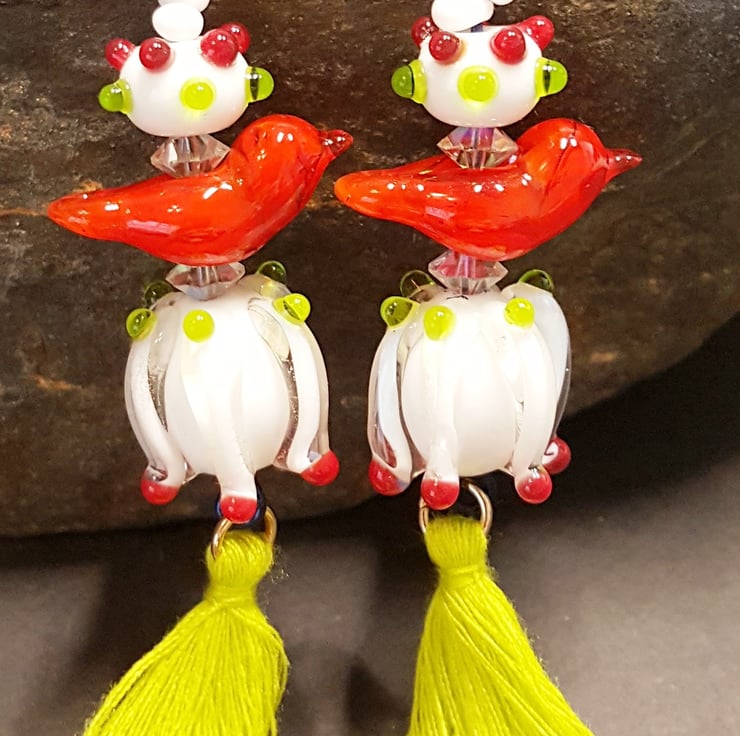 These have been made by me in my studio. The glass birds and beads are made by melting glass rods in the flame to make the beads. I then anneal the glass in a digital kiln for strength. The earrings measure 3.5 inches from the top of the earwires to the bottom of the earring. Sterling silver wires and glass . One of a kind earrings. I have been a Lampworker for over 16 years and sell my beads to jewellery designers the world over. But sometimes I make jewellery from them too :)