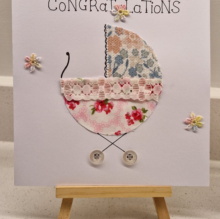 Cute baby girl card made with pretty floral fabric & buttons with hand drawn congratulations.