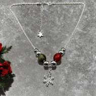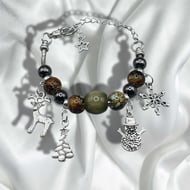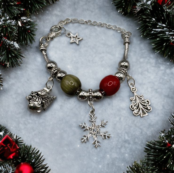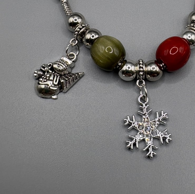Christmas charm bracelet ! Silver plated snake chain bracelet with red, silver and green resin beads. 3 festive charms, a sparkling snowflake , Christmas tree and a snowman silver tone charms.