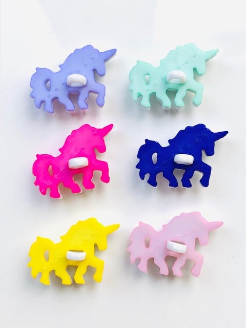 These Packs of 6 Unicorn Shaped Buttons have Green Trims and are 25mm Long by 18mm High. Each Shank Back Button is perfect for your Sewing, Knitting and Crafting Makes - especially for your young-at-heart creations!