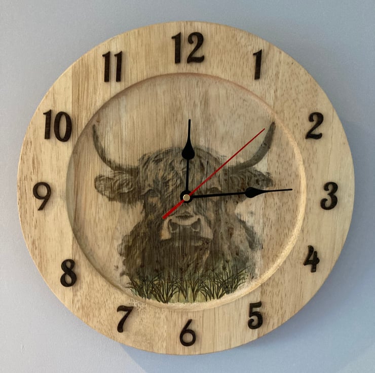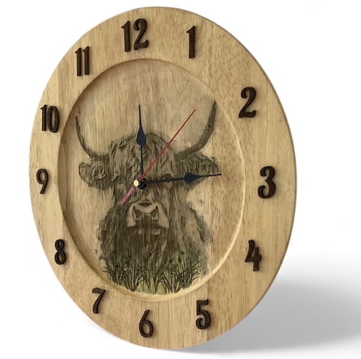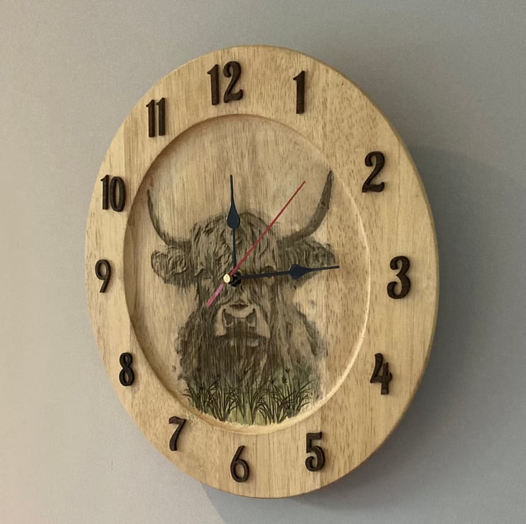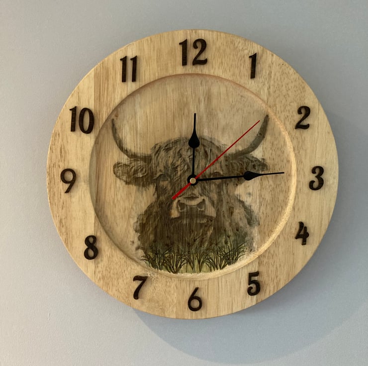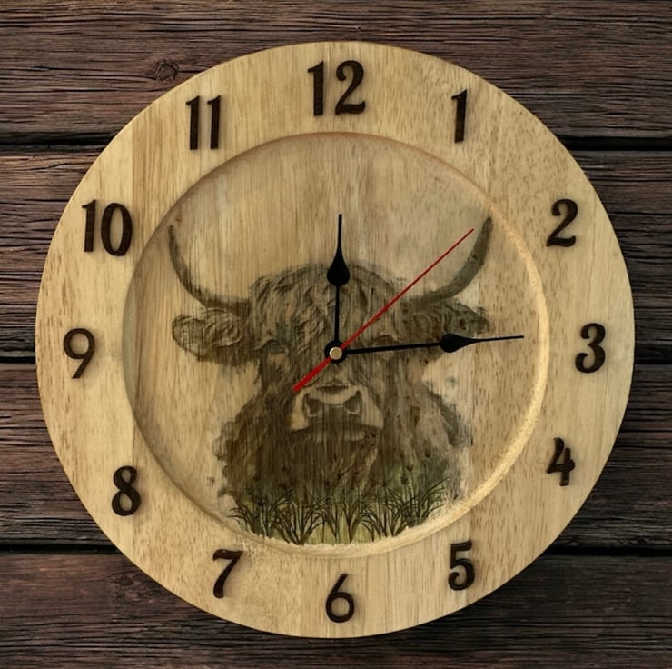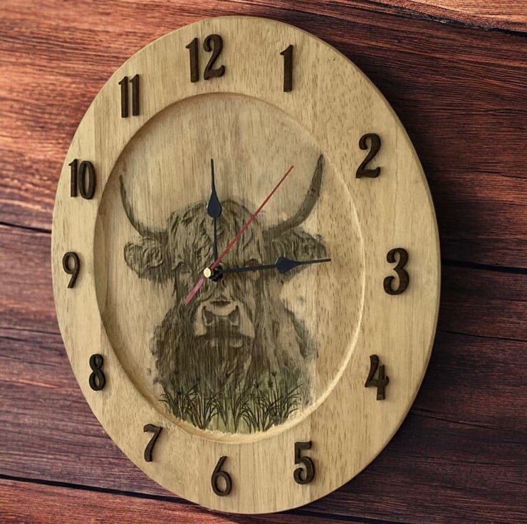 This rustic clock is made using a recycled wooden platter, transformed through a combination of laser engraving and traditional pyrography. The detailed highland cow design is permanently engraved into the wood, giving it a warm and earthy aesthetic.