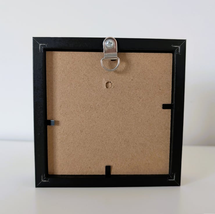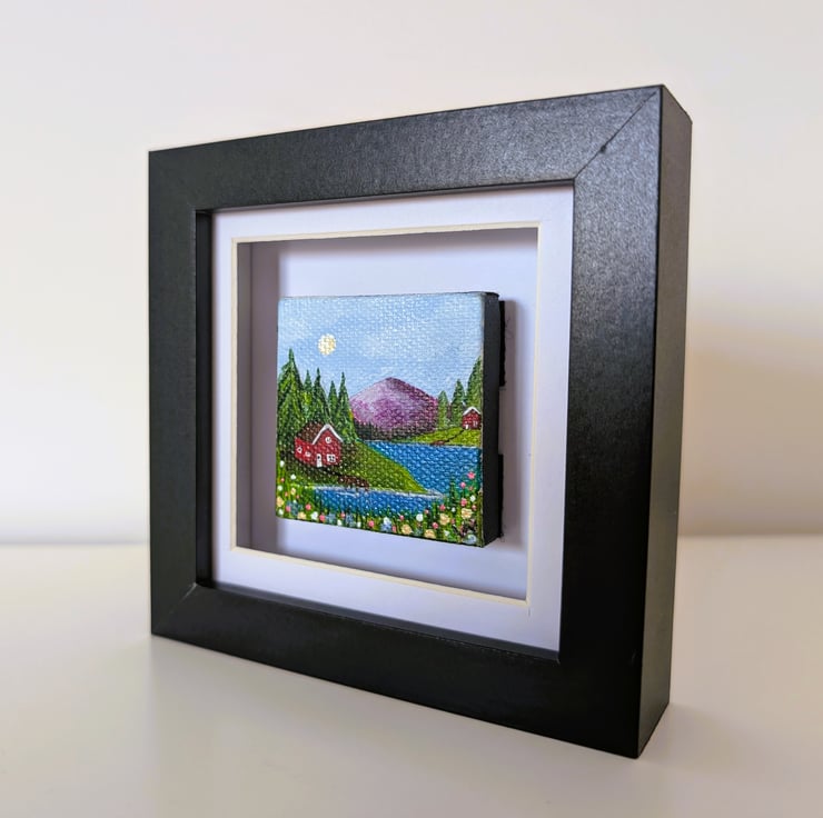 This painting was created in acrylics on a 5 x 5cm square stretched canvas before sealing with a gloss varnish and placed in a black shadow box frame. The overall size of the piece in its frame is 12 x 12cm.