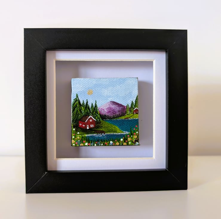 Inspired from the need to escape the busyness of life, this little painting looks towards cosy cottages and calming lakes. There's something so peaceful about sitting watching water ripple gently - the tranquil tinkling as it laps the edges of the lake. To be free and in the moment. So much of my art is influenced by nature and its therapeutic effects. I love nature and that of Scotland (childhood) and Scandinavia (holidays) seem to be influencing me so much right now.