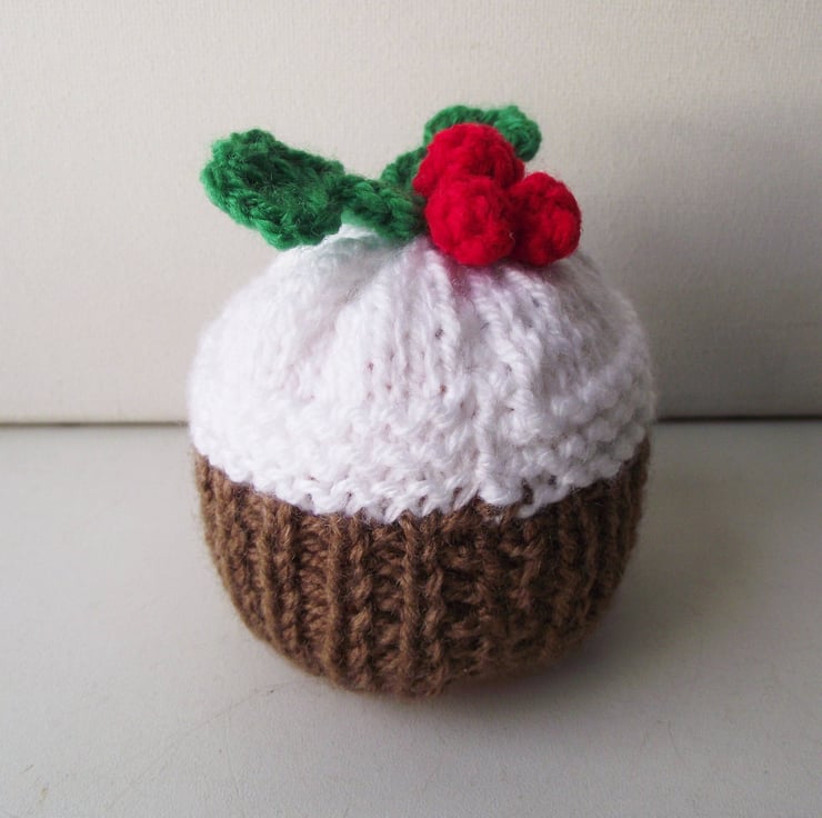 I knitted and crocheted this cute cover for one of 'those' chocolate oranges! (sorry, chocolate orange NOT included- the last photo is for demonstration purposes only). It has a brown 'pudding' base, white 'icing' top and two holly leaves with three holly berries.