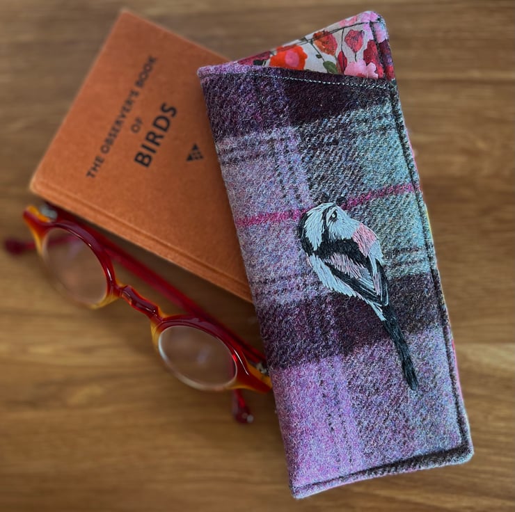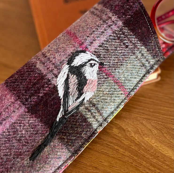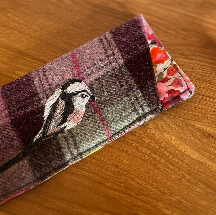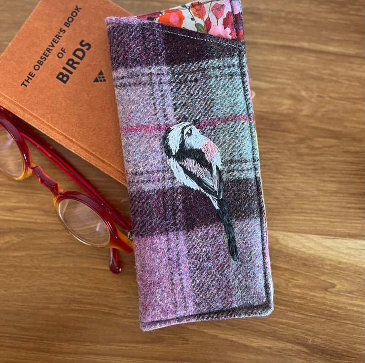 This glasses case has been up cycled from a tartan wool of greens and mauves with a hand embroidery of a long tail tit.