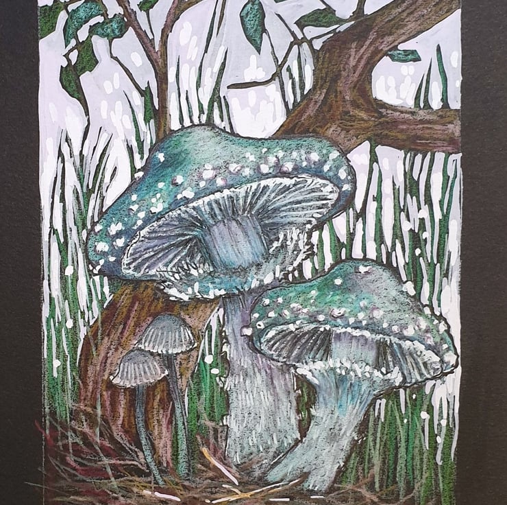 A small colour drawing of Verdigris Agaric, a blue green mushrooms, also known as blue-green stropharia. It is medium-sized green, slimy woodland mushroom, found on lawns, mulch and woodland from spring to autumn. This drawing is on black paper and has a lilac background.