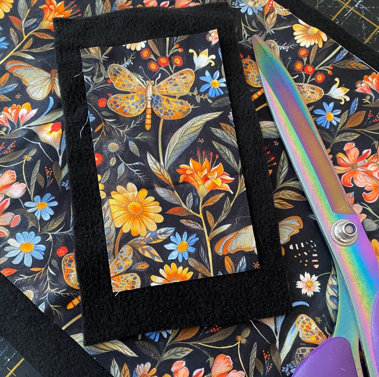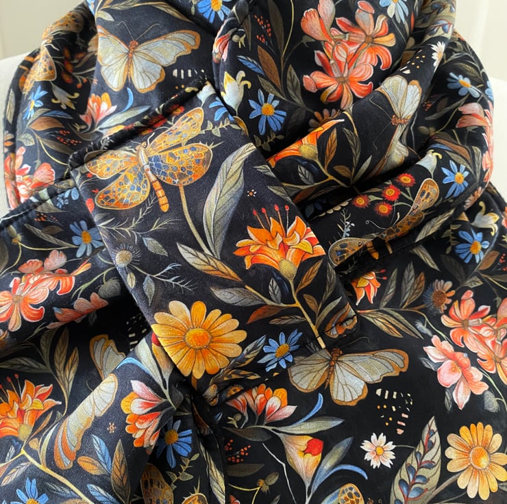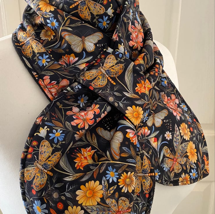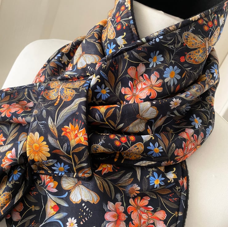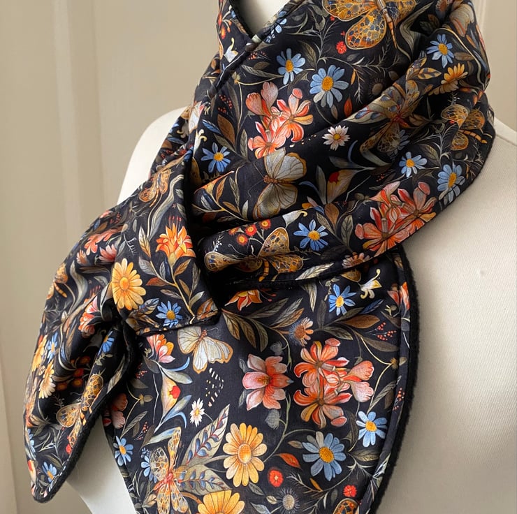 I’ve created this lovely fleece lined neck warmer scarf using a gorgeous cotton print fabric by and lined it with a soft warm fleece which compliments the colour of the outer.