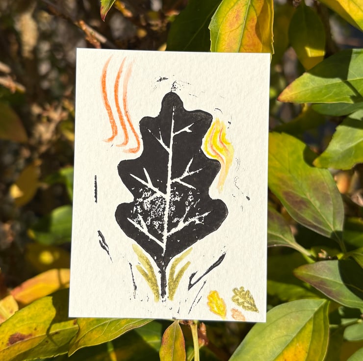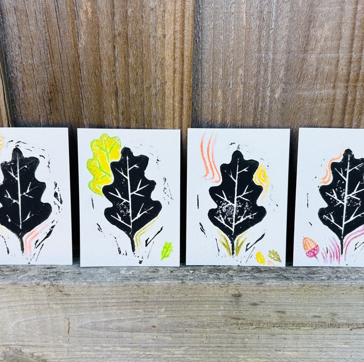 This ACEO measures 2.5" x 3.5" (64mm x 89mm) on 300g/sqm watercolour paper. It features a hand-pressed lino print of an oak leaf, and additional artwork in watercolour pencil.